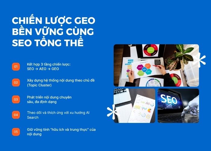 Để GEO thực sự hiệu quả và mang lại kết quả lâu dài, doanh nghiệp nên xem đây là một phần trong chiến lược SEO tổng thể, chứ không phải một hướng đi riêng lẻ.